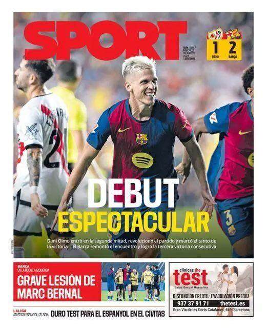 巴萨客场2比1逆转“闪电”巴列卡诺,豪取联赛3连胜登顶,且是唯一开局3连胜的西甲球队。奥尔莫成功注册后并在首秀中打入制胜球,毫无疑问是本场比赛的最大收获,然而小将贝尔纳尔比赛尾声膝盖受伤,却给胜利蒙上了一丝阴翳,主帅弗利克称这是一场“悲伤的胜利”,而据媒体赛后第一时间得到的消息,贝尔纳尔可能是左膝十字韧带撕裂,恐面临长期缺阵。